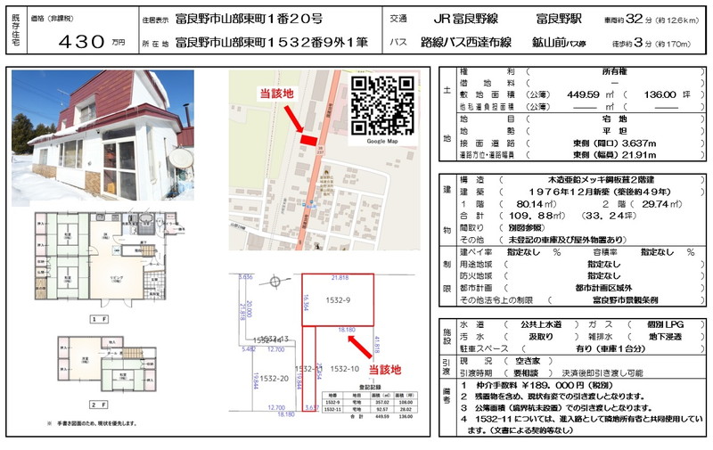 このページを印刷| 所在地 | 【既存物件】富良野市山部東町1532番9外1筆 | ||